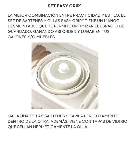 El Set EASY GRIP es de Cerámica ANTI ADHERENTE premium de alta calidad. No cuenta con ningún tipo de componente tóxico (como teflón), y se encuentran registradas y aprobadas por INAL (Instituto Nacional Argentino de Alimentos).